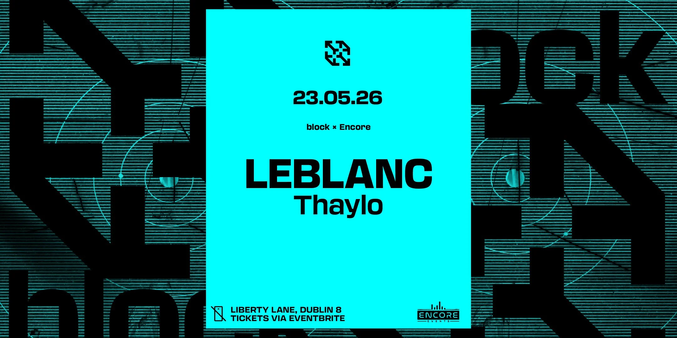 Back to All Events block x encore. LEBLANC Saturday 23 May 2026 22:00 Sunday 24 May 2026 02:30 Google Calendar ICS Tickets Here